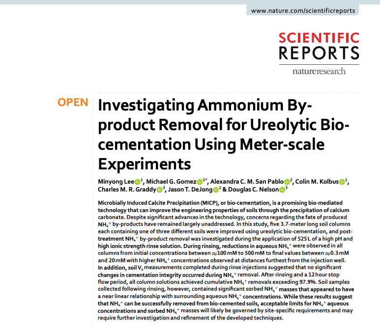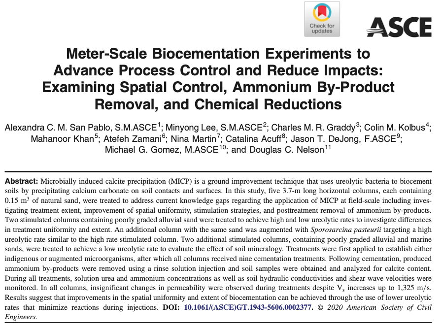 10/21/21 – Congratulations to Minyong Lee who just had a paper accepted in the Journal of Geotechnical and Geoenvironmental Engineering entitled “Effect of Light Biocementation on the Liquefaction Triggering and Post-Triggering Behavior of Loose Sands”. This can be found here: https://ascelibrary.org/doi/abs/10.1061/%28ASCE%29GT.1943-5606.0002707. Many thanks also to our collaborators, Dr. Ziotopoulou and Maya El Kortbawi, who helped tremendously!